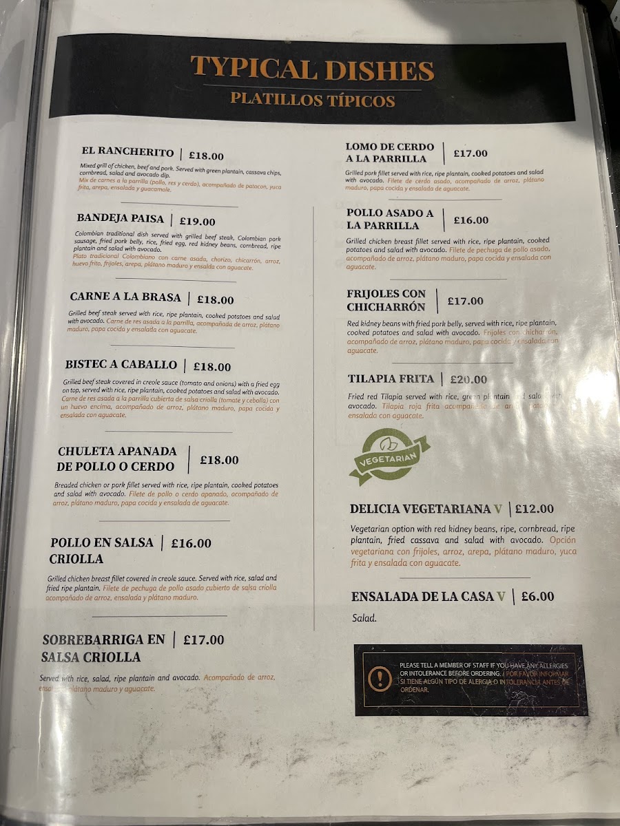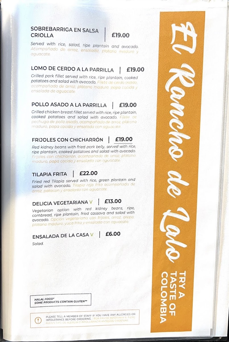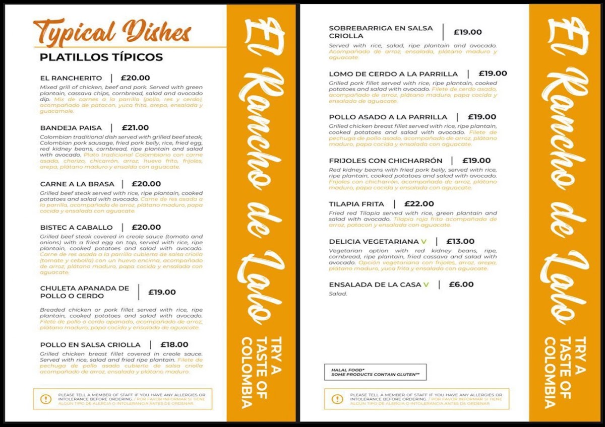 Come and experience the mouthwatering flavors of Colombian cuisine at El Rancho De Lalo! Our menu boasts a variety of tantalizing dishes such as the famous Bandeja Paisa, crispy Empanadas, and refreshing selection of freshly squeezed Juices. Be sure to try our signature dishes like El Rancherito, Sancocho de Pescado, and Pollo Sudado En Salsa Criolla. Indulge in our savory Picada platter, featuring a mix of Sausage, Chicharron, Guacamole, and Fried Pork Belly. Savor the flavors of Chuleta De Pollo Empanizado, Rice, Fried Plantains Salad, and Beef or Grilled Steak. Don't forget to end your meal on a sweet note with a slice of our delectable Strawberry Cheesecake. Wash it all down with a cup of our fragrant Cappuccino or enjoy a light Ensalada for a fresh finish. Come to 1 Buckner Rd in Brixton Hill, London SW2 5BY, United Kingdom, and let us treat you to a dining experience you won't forget!